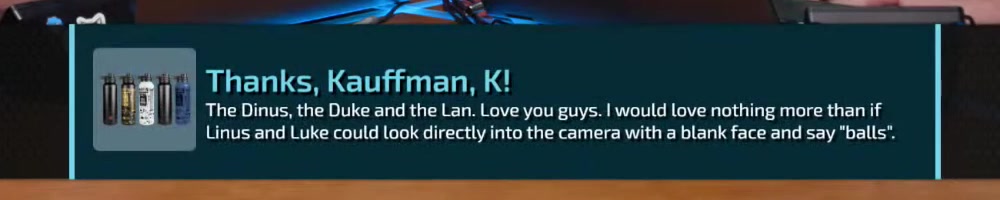 Linus and Luke could look directly into the camera with a blank face and say "balls". | Timestamp |  |