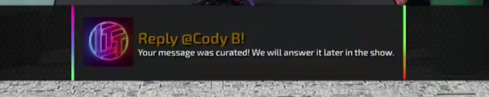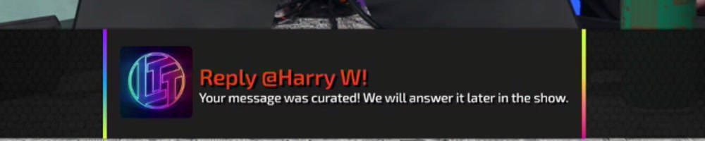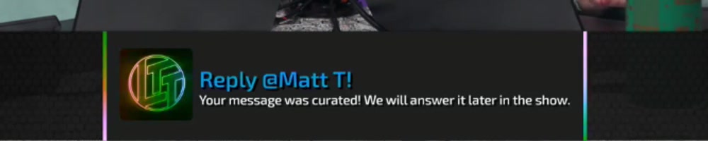 Your message was curated! We will answer it later in the show. | Timestamp |  |