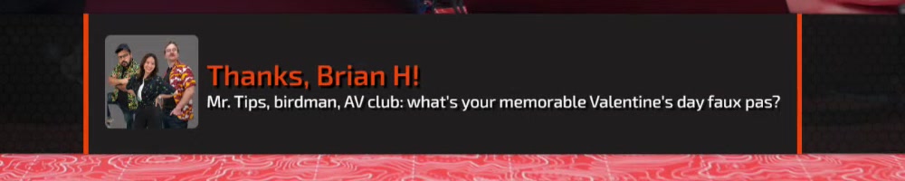 Mr. Tips, birdman, AV club: what's your memorable Valentine's day faux pas? | Timestamp |  |