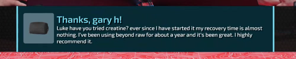 Luke have you tried creatine? ever since I have started it my recovery time is almost