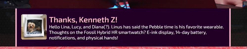 Hello Lina, Lucy, and Diana(?). Linus has said the Pebble time is his favorite wearable.