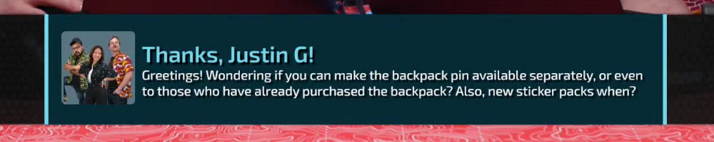 to those who have already purchased the backpack? Also, new sticker packs when? | Timestamp |  |