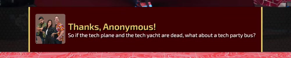 So if the tech plane and the tech yacht are dead, what about a tech party bus? | Timestamp |  |