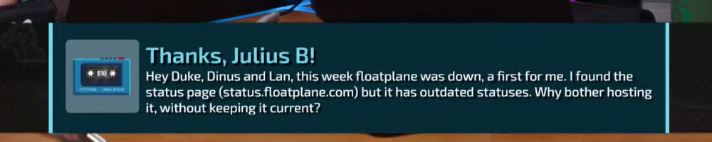 status page (status.floatplane.com) but it has outdated statuses. Why bother hosting