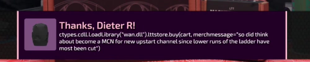 ctypes.cdll.LoadLibrary("wan.dll").lttstore.buy(cart, merchmessage="so did think