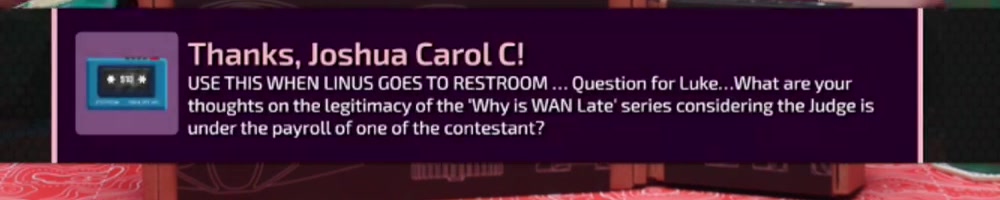USE THIS WHEN LINUS GOES TO RESTROOM... Question for Luke... What are your