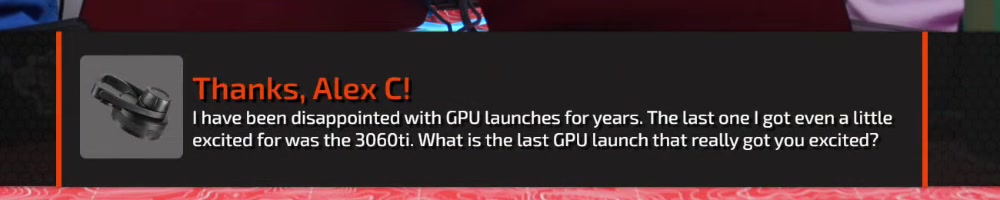 excited for was the 3060ti. What is the last GPU launch that really got you excited? | Timestamp |  |