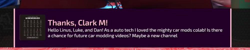 Hello Linus, Luke, and Dan! As a auto tech I loved the mighty car mods colab! Is there
