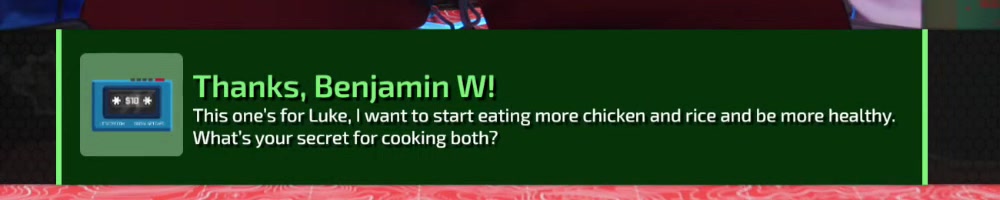 This one's for Luke, I want to start eating more chicken and rice and be more healthy.