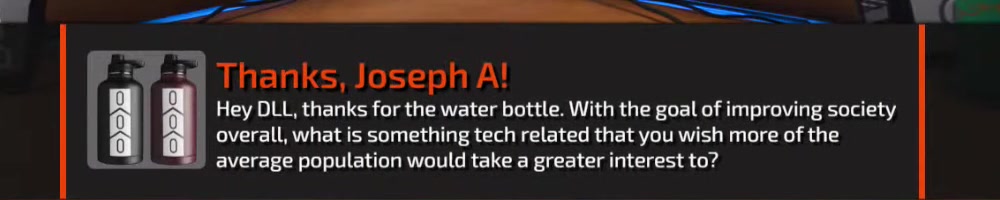 Hey DLL, thanks for the water bottle. With the goal of improving society
