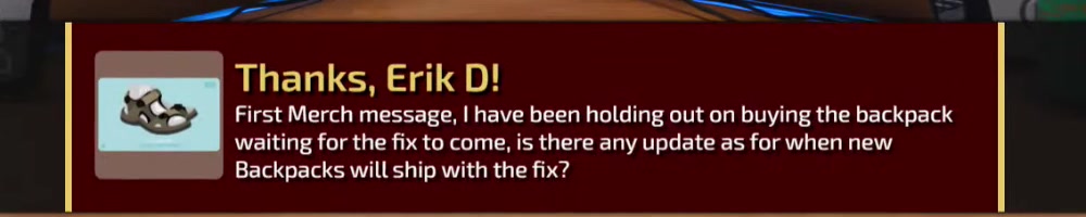 Backpacks will ship with the fix? | Timestamp |  |