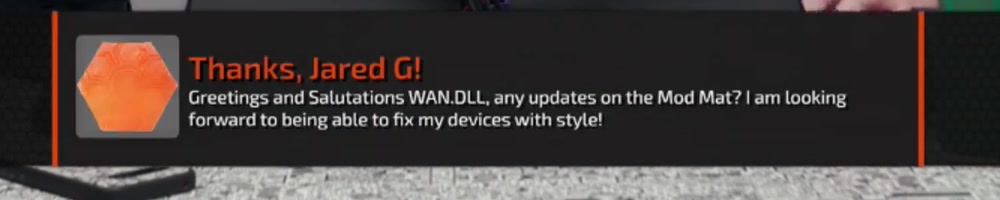Hello .DLL Would love an update on Modmat and clear screwdriver, when should we