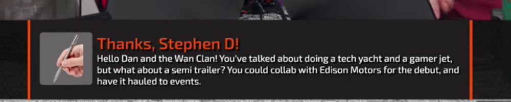 Hello Dan and the Wan Clan! You've talked about doing a tech yacht and a gamer jet,
