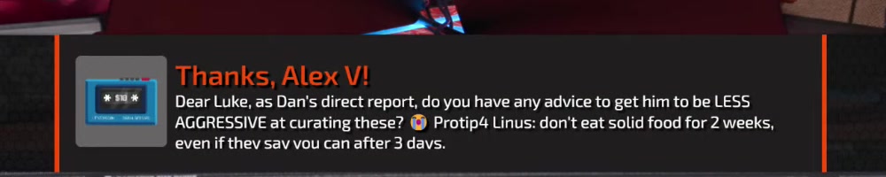 AGGRESSIVE at curating these? Protip4 Linus: don't eat solid food for 2 weeks,