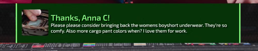 comfy. Also more cargo pant colors when? I love them for work. | Timestamp |  |