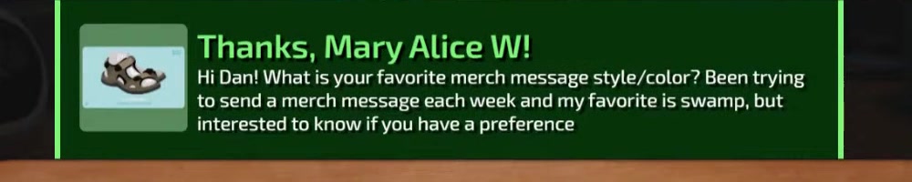 @ Hi Dan! What is your favorite merch message style/color? Been trying