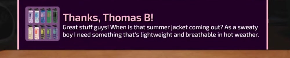 ""lé‘,' Great stuff guys! When is that summer jacket coming out? As a sweaty