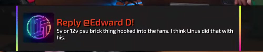 5v or 12v psu brick thing hooked into the fans. I think Linus did that with