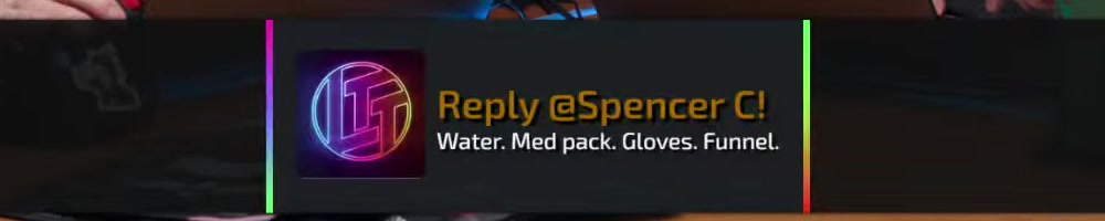 Water. Med pack. Gloves. Funnel. | Timestamp |  |