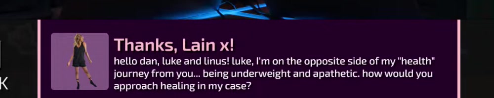 hello dan, luke and linus! luke, I'm on the opposite side of my "health"