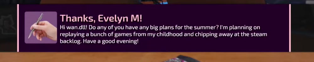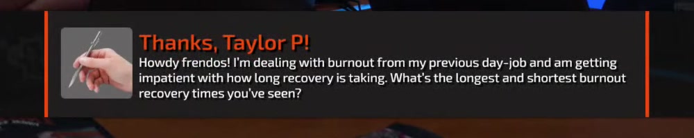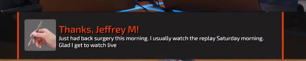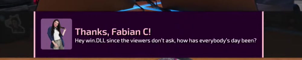 Hey win.DLL since the viewers don't ask, how has everybody's day been? | Timestamp |  |