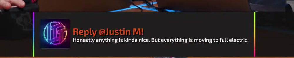 Honestly anything is kinda nice. But everything is moving to full electric. | Timestamp |  |