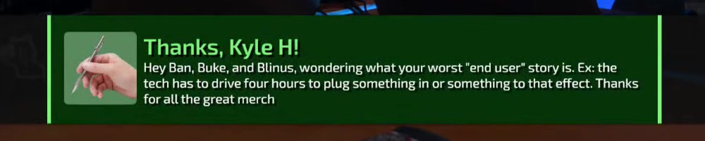 Hey Ban, Buke, and Blinus, wondering what your worst "end user" story is. Ex: the