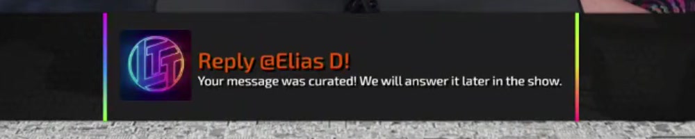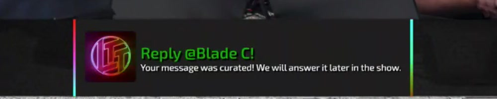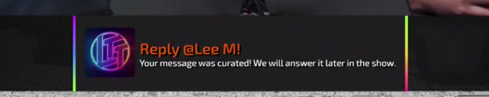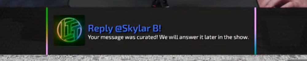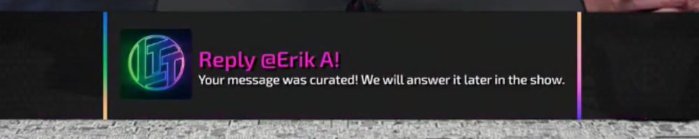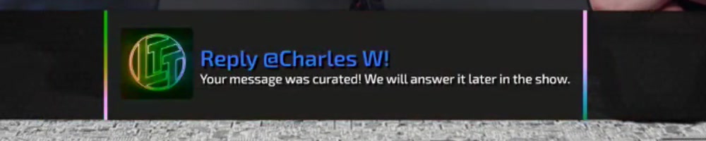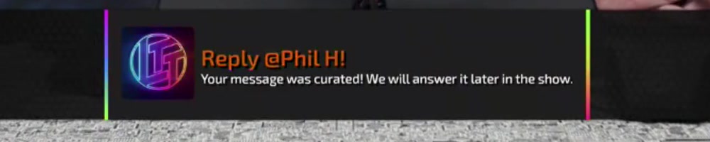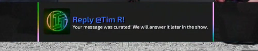 Your message was curated! We will answer it later in the show. | Timestamp |  |