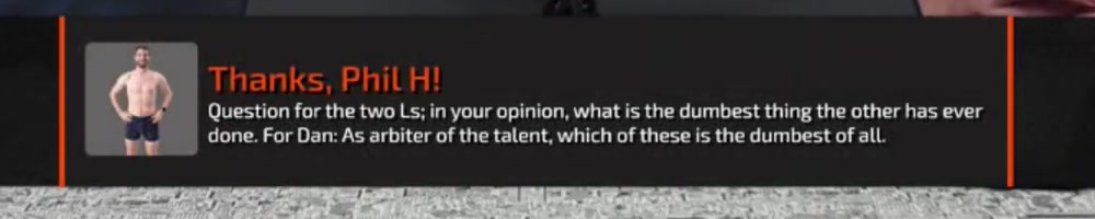 done. For Dan: As arbiter of the talent, which of these is the dumbest of all. | Timestamp |  |