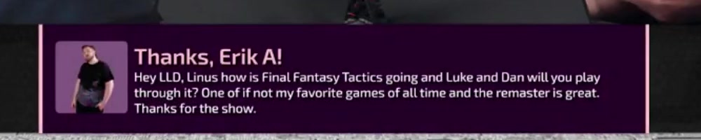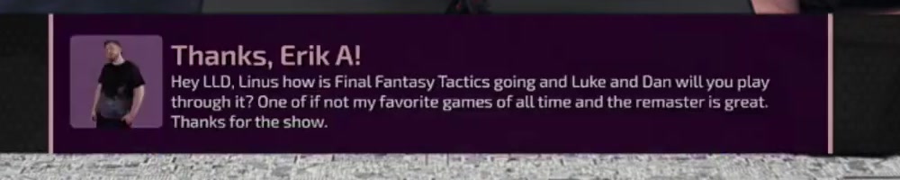 Hey LLD, Linus how is Final Fantasy Tactics going and Luke and Dan will you play