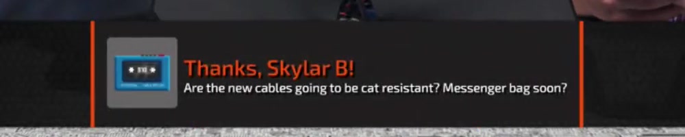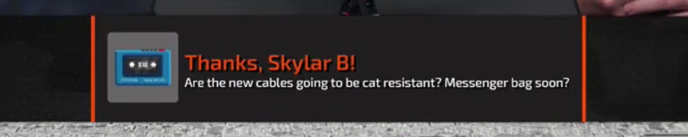 Are the new cables going to be cat resistant? Messenger bag soon? | Timestamp |  |