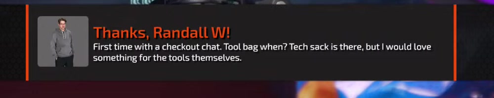 First time with a checkout chat. Tool bag when? Tech sack is there, but I would love
