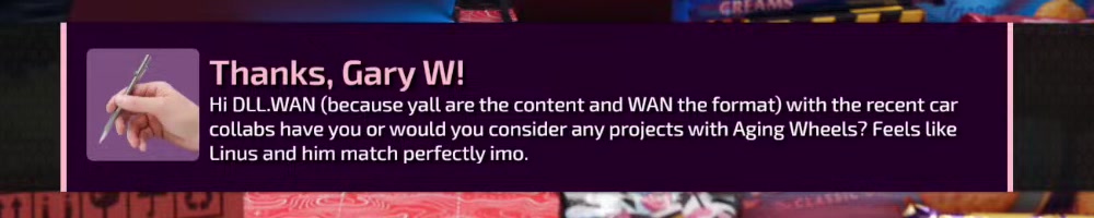 Hi DLL.WAN (because yall are the content and WAN the format) with the recent car
