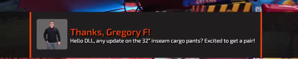 Hello DLL, any update on the 32" inseam cargo pants? Excited to get a pair! | Timestamp |  |