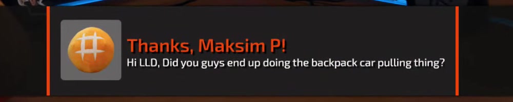 Hi LLD, Did you guys end up doing the backpack car pulling thing? | Timestamp |  |