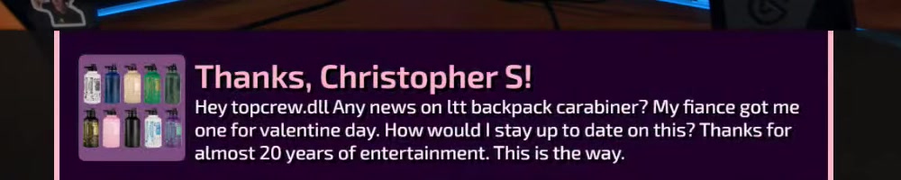 Hey topcrew.dll Any news on ltt backpack carabiner? My fiance got me