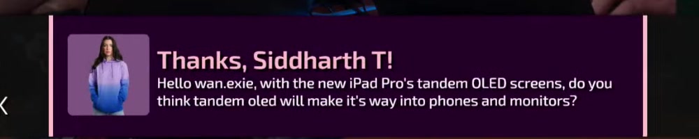think tandem oled will make it's way into phones and monitors? | Timestamp |  |
