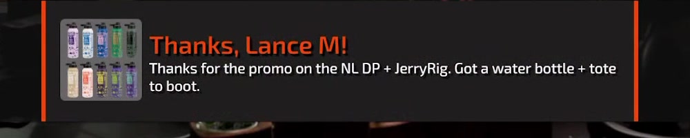 3 Thanks for the promo on the NL DP + JerryRig. Got a water bottle + tote