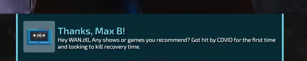 Hey WAN.dll, Any shows or games you recommend? Got hit by COVID for the first time