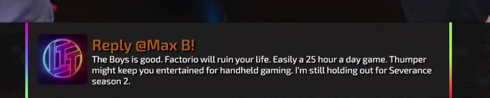 The Boys is good. Factorio will ruin your life. Easily a 25 hour a day game. Thumper