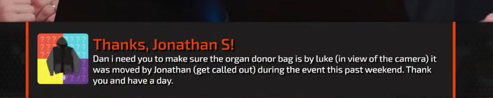 Dan i need you to make sure the organ donor bag is by luke (in view of the camera) it
