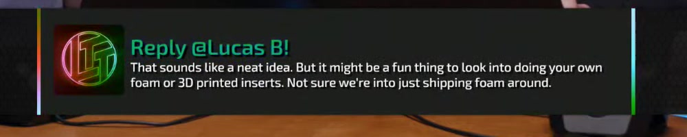 foam or 3D printed inserts. Not sure we're into just shipping foam around. | Timestamp |  |