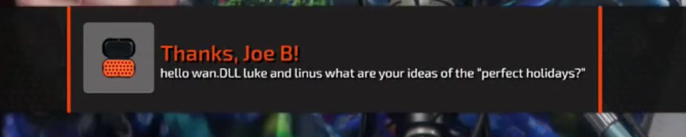 hello wan.DLL luke and linus what are your ideas of the "perfect holidays?" | Timestamp |  |