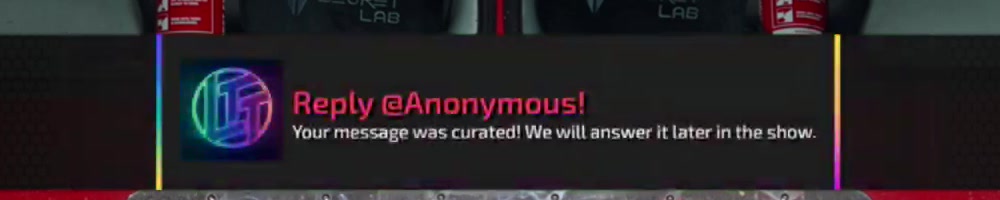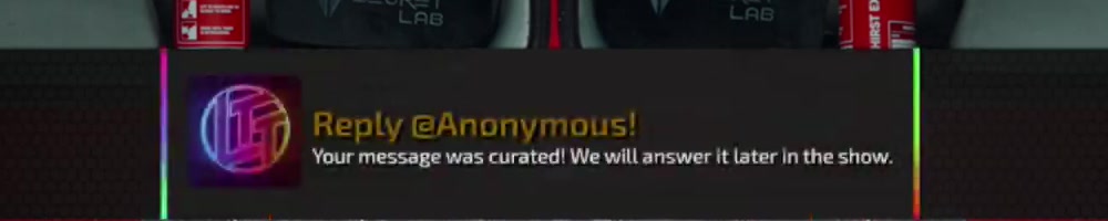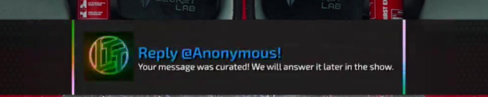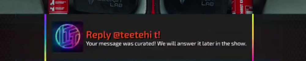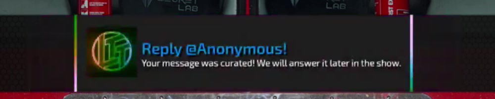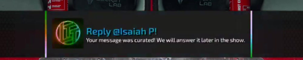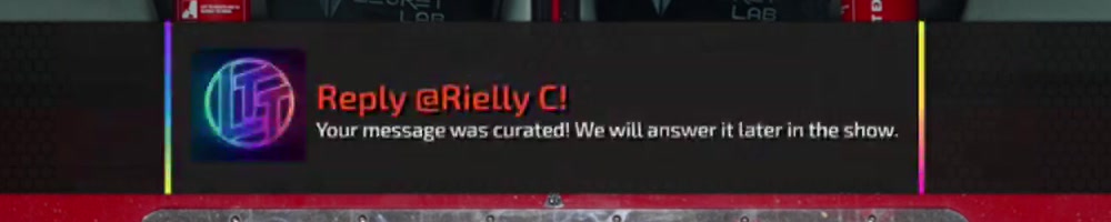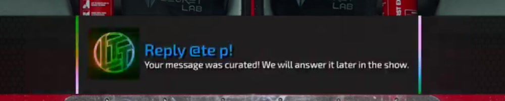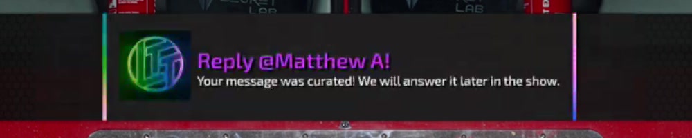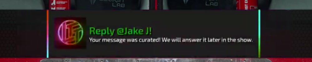 Your message was curated! We will answer it later in the show. | Timestamp |  |