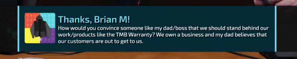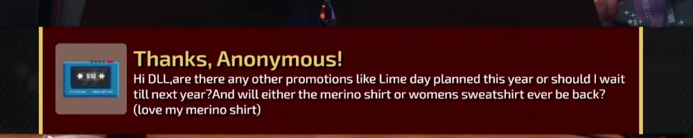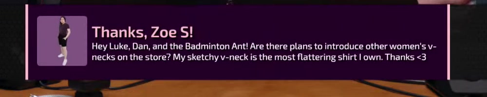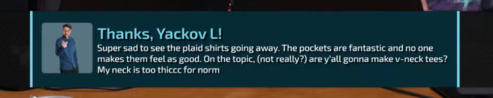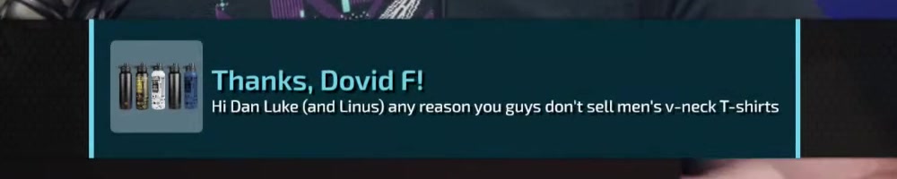 Hi Dan Luke (and Linus) any reason you guys don't sell men's v-neck T-shirts | Timestamp |  |