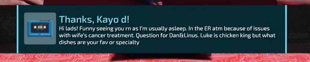 with wife's cancer treatment. Question for Dan&Linus. Luke is chicken king but what