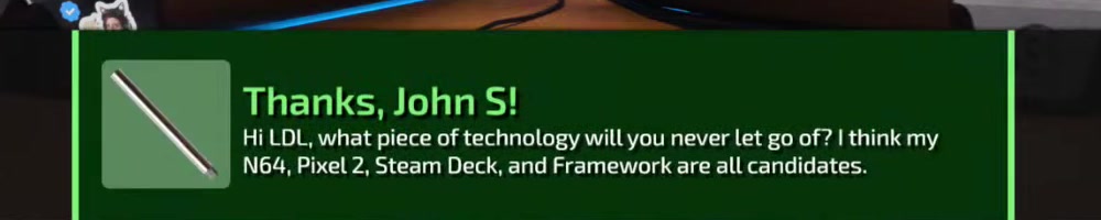 N64, Pixel 2, Steam Deck, and Framework are all candidates. | Timestamp |  |