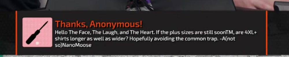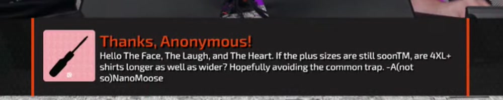 Hello The Face, The Laugh, and The Heart. If the plus sizes are still soonTM, are 4XL+