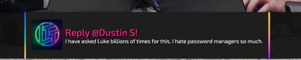 I have asked Luke billions of times for this. I hate password managers so much. | Timestamp |  |