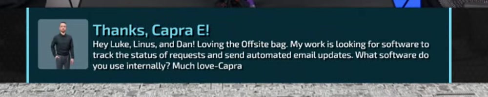 Hey Luke, Linus, and Dan! Loving the Offsite bag. My work is looking for software to